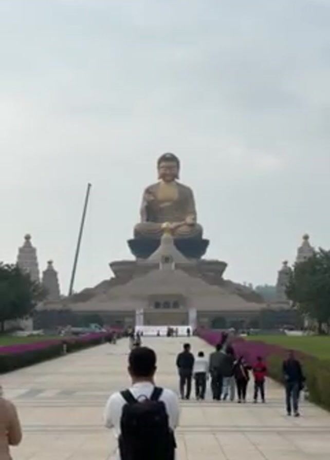 wide shot of a large Buddha statue at the end of a wide walkway. The statue is bronze in color and sits on top of a multi-tiered platform. There are several smaller pagoda-like structures on either side of the walkway. A crane can be seen to the left of the statue. People are walking along the walkway towards the statue. The sky is overcast. In the foreground, a person with a black backpack is also walking towards the statue.