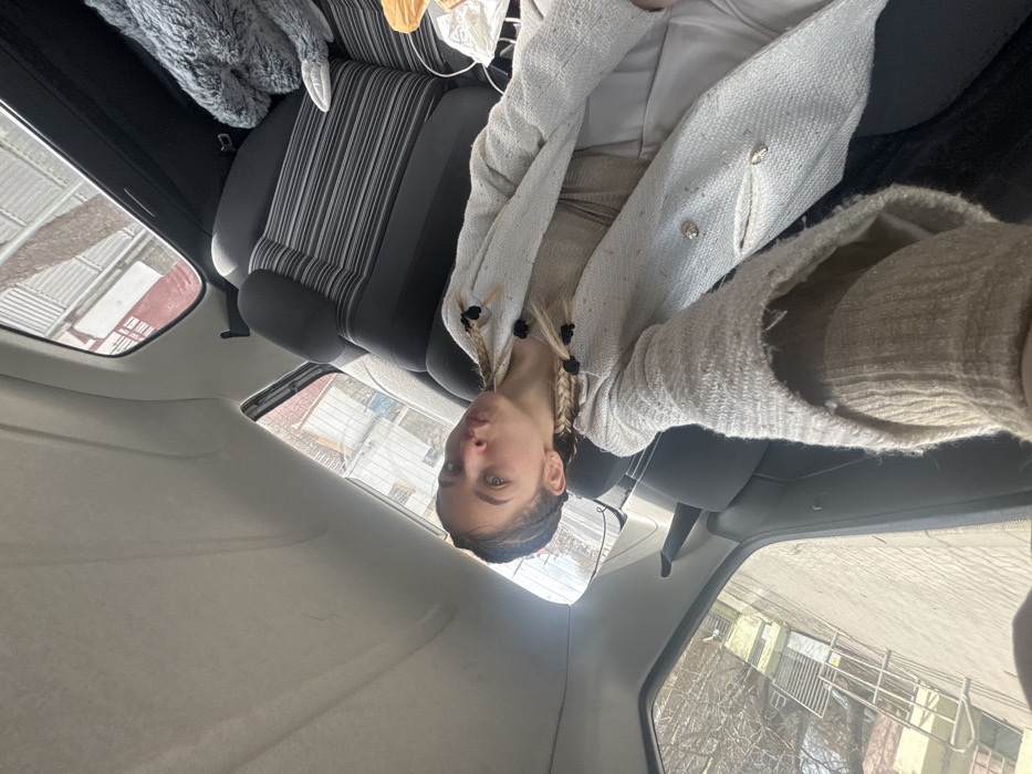 A young female is seated in the rear passenger compartment of a vehicle, angled towards the camera, which she appears to be holding for a selfie
