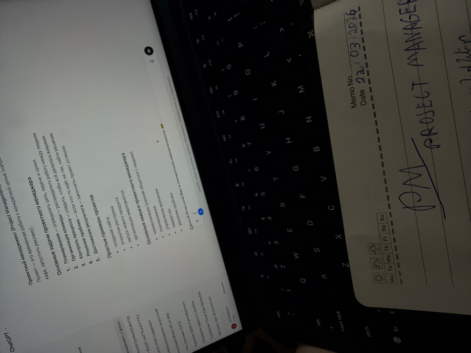 The image displays a close-up, high-angle view of a laptop and a physical notebook in Abovyan, Armenia, under dim ambient lighting. A black laptop is open, with its illuminated screen dominating the upper portion of the frame. The laptop screen shows a white interface from "ChatGPT" with black text, primarily in Russian, outlining "Project Management" concepts, tasks, project examples, and skills. A sidebar on the left of the screen also contains text, some of which is in Armenian. The laptop's dark QWERTY keyboard occupies the middle ground. In the foreground, resting on or near the laptop's palm rest, is a light-colored memo pad. The memo pad features pre-printed fields for "Memo No." and "Date," where "22/03/2026" is handwritten in blue ink. Below these, the words "PM PROJECT MANAGER" are handwritten in blue, followed by additional handwritten text in Armenian. No individuals are visible, but the setup indicates a user engaged in research or learning activities.