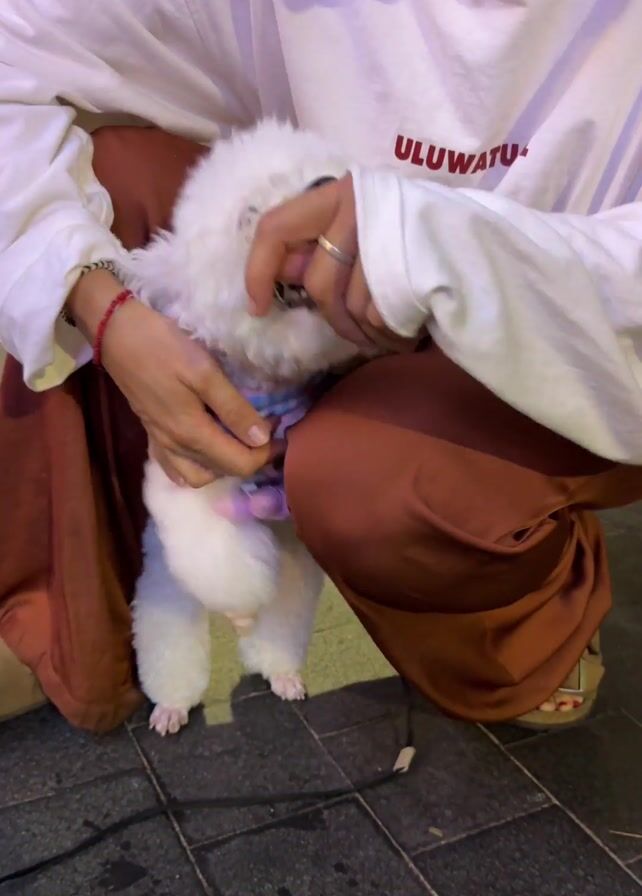 A person wearing a white long-sleeved shirt with the word “ULUWATU” printed on it and brown pants is crouching down on a tiled surface. They are holding a small, white, fluffy dog in their lap. The dog is wearing a blue and pink checkered harness. The person is adjusting the dog’s harness and petting its head. The dog looks around and opens its mouth. There are lights and a blurred background in the distance.