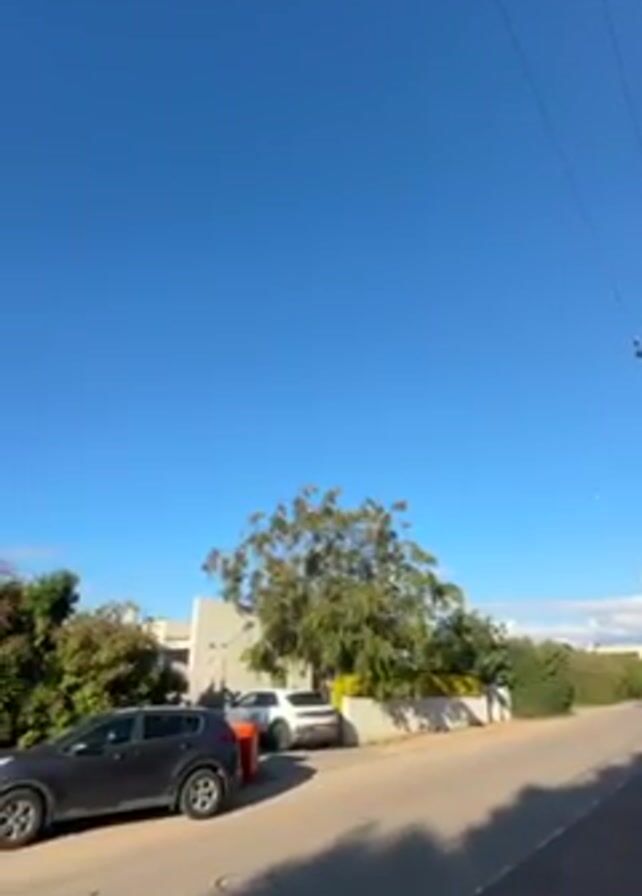suburban street on a bright, sunny day with a clear blue sky. There are several parked cars on the left side of the street, including a dark gray SUV and a white SUV. The street is paved and has sidewalks on either side. There are trees and bushes lining the street, and some houses are visible behind the greenery. Power lines run overhead. The camera pans slowly to the left, capturing more of the street and the surrounding houses.