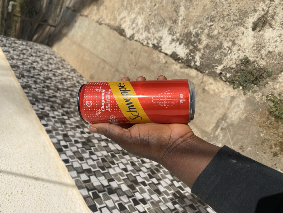 A dark-skinned human hand, wearing a dark long-sleeved garment on the forearm, holds a red and yellow Schweppes Chapman carbonated soft drink can