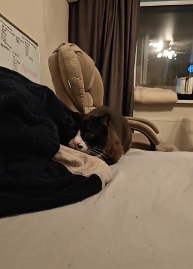 A cat lies on a bed, partially obscured by a folded black sweater with a pink corner. The cat is mostly black with a white nose and forehead, brown patches on its flanks, and yellow eyes wide with surprise. Behind the bed is a beige office chair, closed brown curtains, and a window with a light outside. A whiteboard is visible on the left wall. The cat is looking forward, with its ears perked. The bed has a white or very light gray cover. The lighting is soft and warm.