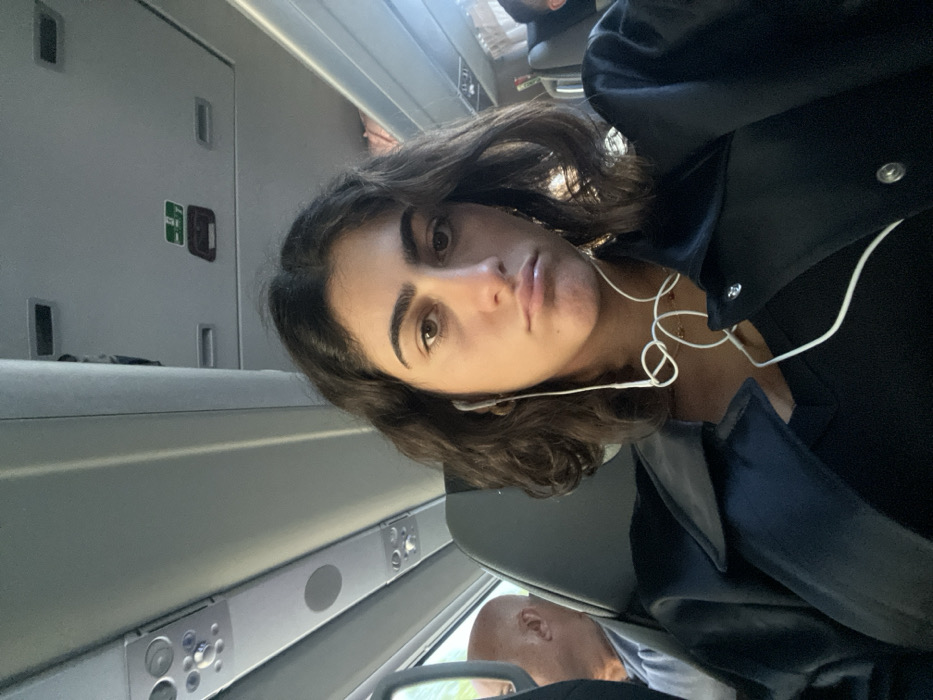 A young female with dark, wavy, shoulder-length hair and brown eyes is centered, looking directly at the camera with a pouting expression. She is seated inside a passenger coach or bus, wearing a black v-neck top and a black collared jacket. White wired earphones are in her ears, with the cable visibly tangled across her chest. To her left, partially visible behind a seat, is the bald head of an older male passenger. The vehicle's interior features grey overhead panels with air vents, reading lights, and an emergency exit sign. This scene occurs within a passenger transport vehicle in the city of Pombal, Portugal.