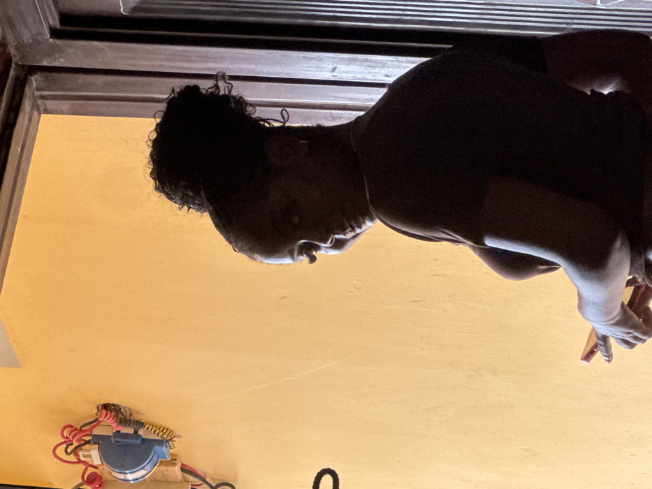 A female individual is positioned in a three-quarter profile, looking over her left shoulder towards the viewer with a slight smile. She has dark, curly hair styled in an updo and prominent eyelashes. She wears a dark, short-sleeved top and holds a red or orange-colored smartphone in her left hand, positioned near her lower torso. The background features an orange-hued wall on the left, against which an electrical utility device, possibly a meter or fuse box, is mounted. This device is blue and white with red and yellow insulated wiring connected. A dark, coiled cable hangs below it. To the right of the individual, a dark, vertical architectural element, appearing to be a door frame or panel, is visible. The scene is illuminated from the left, casting the individual into partial silhouette. This scene is located in Gbongan, Nigeria.