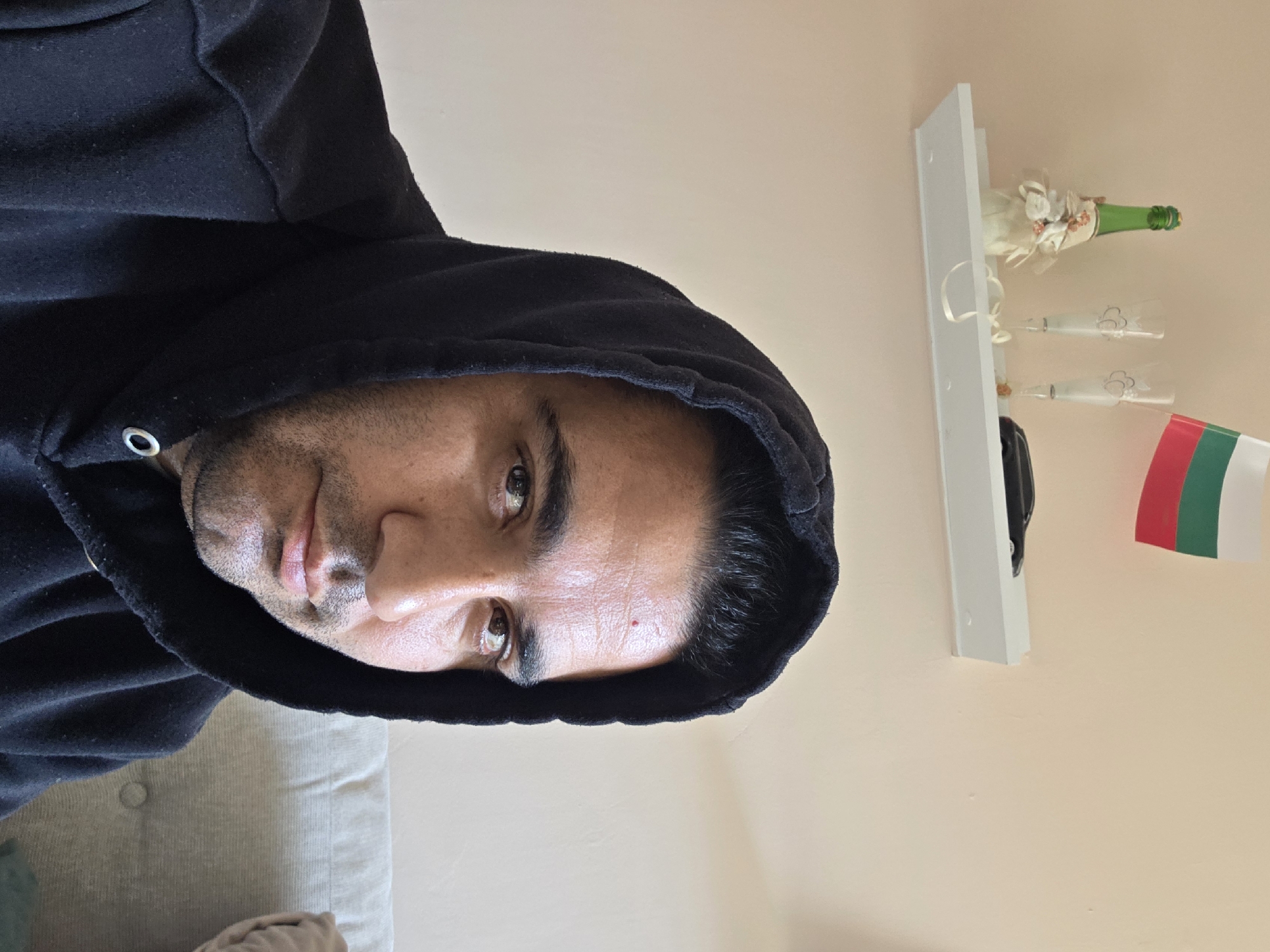 The image displays a male individual in a domestic interior setting located in Drazhevo, Bulgaria. The man, seen from approximately the chest up, has short dark hair visible beneath a black hooded sweatshirt with the hood drawn over his head. He possesses short facial stubble and looks directly at the camera. The background features a plain, light beige-pink wall. A white floating shelf is mounted on this wall behind the individual's head. On the shelf, from left to right, are: a green bottle, possibly champagne, decorated with white fabric, ribbons, and small artificial flowers; two tall, clear champagne flutes with etched heart designs; a small Bulgarian flag displaying horizontal white, green, and red stripes; and a miniature black car model. A portion of a light-colored, possibly fabric-upholstered, sofa with a single visible button is present on the right side of the frame, behind the man's shoulder.