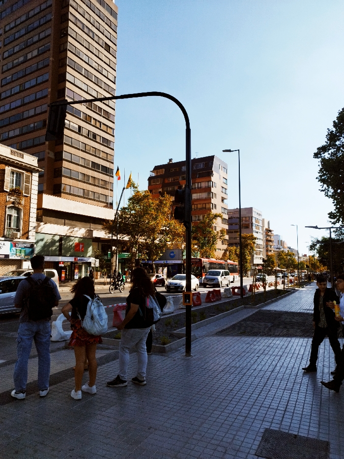 A bustling city street scene unfolds with pedestrians waiting at a crosswalk. Traffic flows along a divided boulevard with cars, buses, and a lone cyclist visible. Tall buildings rise on either side, some with flags waving atop. Autumnal trees add a splash of color. The sky is bright blue, contributing to the vibrant urban setting.