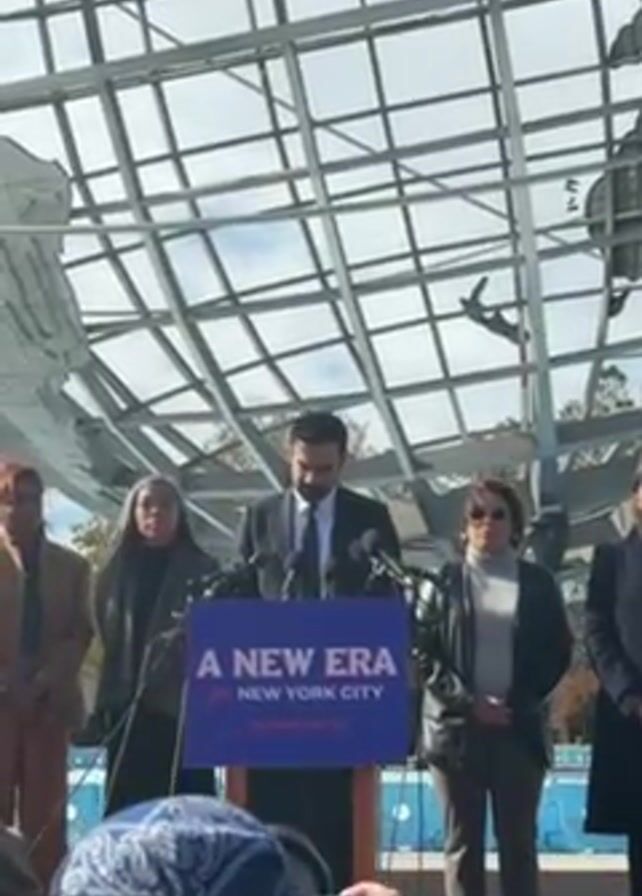 A man wearing a black suit and tie speaks from behind a podium, with the words "A New Era for New York City" on the front. Four people stand behind the man, including three women and one man. The man speaks in front of a crowd of people, some of whom are holding cameras. The event is taking place outdoors in front of a large spherical structure. The sky is visible in the background.