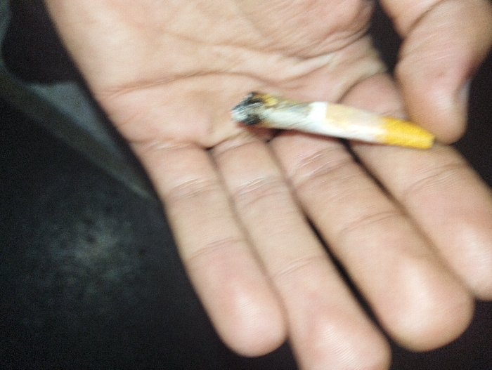 The scene occurs in the city of Tangier, Morocco. A human hand, appearing adult with a light-to-medium skin tone, is centered in the frame. The palm is open, with fingers slightly flexed. The hand holds a partially consumed, hand-rolled cigarette with a distinct yellow-orange stained filter. The opposite end of the cigarette exhibits glowing embers, ash, and burnt material. The background is dark, undifferentiated, and out of focus.