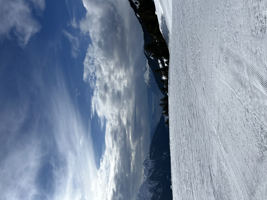 The image displays a panoramic winter landscape from a snow-covered elevation in Villard-sur-Doron, France. The foreground consists of a wide expanse of groomed snow, showing parallel tracks from a snowcat on the lower right, alongside various ski and snowboard trails. No individuals or specific objects are present on the snow. Beyond the immediate foreground, a line of dark green conifer trees marks the edge of a midground slope, which is also covered in snow. The trees cast shadows onto the pristine white surface. In the background, a vast valley stretches out, partially obscured by atmospheric haze or low clouds. Distant, rugged mountain ranges with snow-capped peaks are visible on both the left and right sides of the valley. The sky above is a mix of bright blue patches and various cloud formations, ranging from high, wispy cirrus clouds to lower, denser cumulus and stratocumulus clouds, casting dynamic light and shadows across the scene. The overall lighting suggests partial sunlight breaking through the cloud cover.