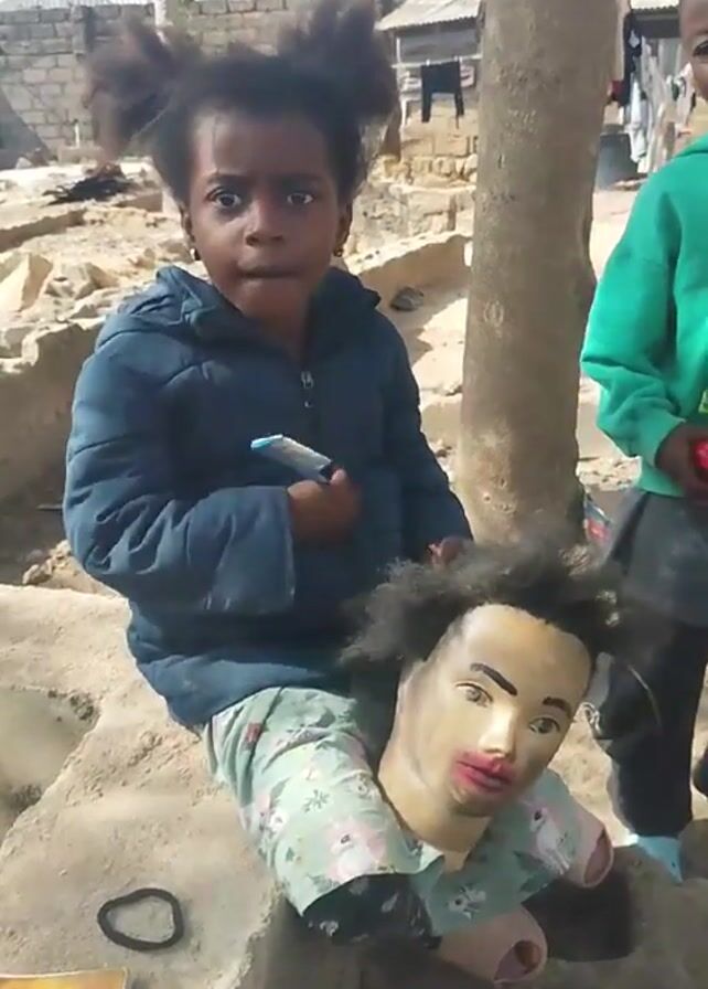 A young girl, likely between three and five years old, sits on a weathered, stone-like structure outside. She has dark skin, dark eyes, and her hair is styled in two playful, upright buns. She wears a dark blue, quilted jacket, a patterned top, and dark leggings. In her hands, she holds a light blue comb and seems to be brushing the hair of a mannequin head positioned beneath her. The mannequin head is attached to what appears to be a doll's body wearing a light green, floral shirt. The mannequin's face is painted with heavy makeup, especially red lipstick. Another child, possibly a boy, stands to the right, partially visible, wearing a green sweatshirt and dark pants. The setting appears to be an outdoor area with a tree to the right, a stone or concrete structure under the children, and in the background, there is a glimpse of houses, a wall, and what might be a construction or communication tower. A notebook, charging cable, and an AC adapter rest on the left corner of the stone surface where the girl sits. The scene captures a candid moment of play. The girl looks directly at the camera, opens her mouth wide and smiles, and says ‘Hi.’