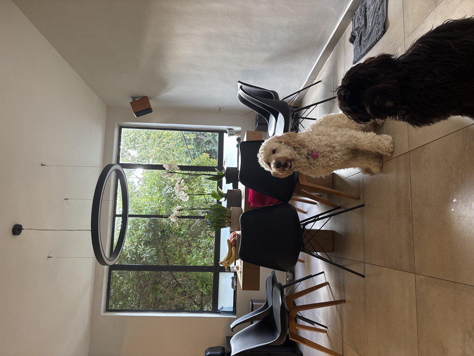 This image depicts an interior scene, likely a dining area, within a residence in Ramat HaSharon, Israel. Two dogs are prominently featured in the foreground and mid-ground. The primary subject is a medium-sized, light-colored dog, likely a Goldendoodle or Labradoodle, with wavy cream-colored fur. It is seated upright on the tiled floor in the mid-ground, facing slightly left with its mouth open, displaying its tongue. A pink collar is visible around its neck. Partially visible in the lower right foreground is a second, dark-colored dog, likely a Portuguese Water Dog or similar breed, with curly black fur. This dog is also seated and appears to be looking directly towards the viewer. Behind the dogs, a rectangular wooden dining table occupies the central background. Six black chairs with wooden legs are arranged around the table. On the table, various items are present, including a bowl of fruit (bananas, apples, oranges), and three potted plants; two containing white orchids and one with blue hyacinth-like flowers. Above the table, a contemporary black circular chandelier hangs from the ceiling. The back wall features large windows spanning its width, revealing an exterior view dominated by dense green foliage, consistent with trees. The interior walls are light-colored, and the floor is covered with large, light-toned ceramic tiles. To the upper right, a wooden speaker is mounted on the wall. A dark, rectangular mat or rug is visible on the floor in the far right background. Natural light illuminates the scene, primarily from the windows. No human subjects are visible.