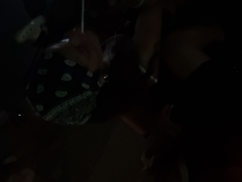 The image depicts a dimly lit scene in Uluwatu, Indonesia. A person, primarily visible from the chest upwards and angled towards the right, occupies the central frame. The individual wears a dark head covering, possibly a bandana, featuring a repeating light-colored paisley pattern, predominantly green or teal, against a black background. A light-skinned hand, likely the individual's right hand, holds a thin, white, stick-like object to the mouth area. The person is dressed in dark clothing, largely obscured by shadow. Other indistinct, darker shapes and forms are present in the foreground and background, indicating other subjects or objects, but details are not discernible due to extremely low light conditions. The overall environment is dark and lacks specific identifiable features beyond the main subject.