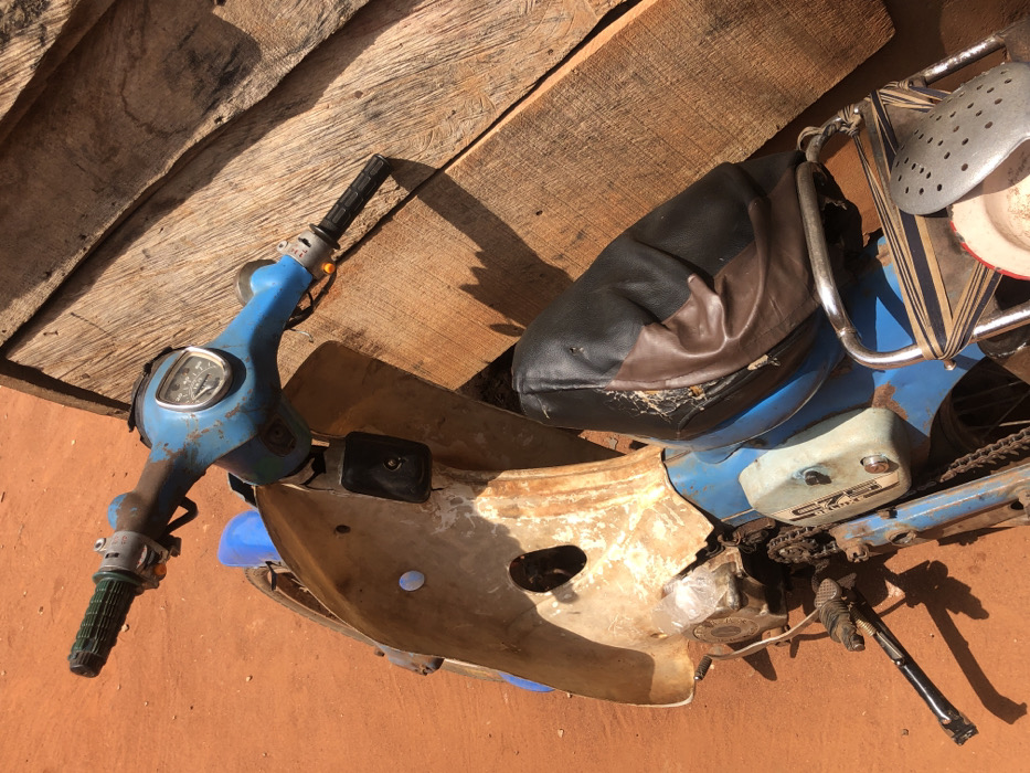 This image depicts a heavily used, blue step-through motorcycle parked on reddish-brown lateritic soil in Oraukwu, Nigeria