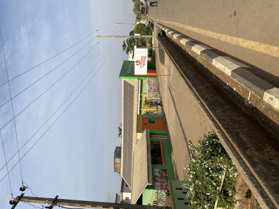 The image depicts a daytime street scene in Maigizo, Nigeria, under a clear, pale blue sky. On the left, a commercial establishment identified as "Chicken 'n' More" is visible. The main building features a light green facade with orange trim and a roof largely covered by solar panels. An adjacent, smaller light green structure with an orange serving counter and a light-colored corrugated metal roof stands closer to the foreground. A white rectangular sign bearing the "Chicken 'n' More" logo and text is mounted on an orange pole in front of the establishment. The property is bordered by a green metal fence with pointed tops. In front of the "Chicken 'n' More" complex, a paved walkway or parking area leads to the right. One individual in a blue shirt and dark trousers is walking from left to right across this paved area. To the right of the paved area, a concrete drainage ditch runs parallel to an asphalt road. The ditch contains soil and minor debris. The road features a yellow centerline and black and white striped curbs. Further down the road, a white pickup truck is visible, with a second individual standing near it. Multiple wooden utility poles with overhead electrical wires are positioned along the road and extend across the sky. In the lower-left foreground, a dense green bush with white flowers grows beside the drainage ditch. Scattered trees and additional buildings, including one with a visible water tank, are present in the background.