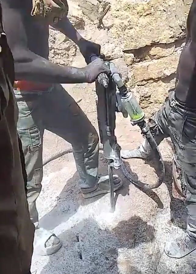 In a medium shot, three men are using a jackhammer to drill into a concrete-like surface. The main operator, covered in dust, wears jeans, a baseball cap, and no shirt. He grips the jackhammer with both hands, guiding the drill bit into the ground. A second man, also shirtless and covered in dust, stands nearby, his hand near a hose connected to the jackhammer. A third man, partially obscured, stands to the side. The background shows a rocky, earth-toned wall. Dust rises from the drilling activity, and sunlight casts shadows.