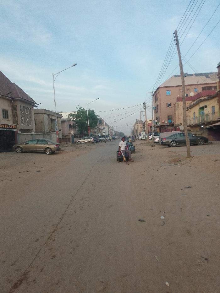 An overcast sky illuminates a street scene. Buildings line both sides, hosting various parked cars. A man pushes a small, wheeled vehicle down the center of the street. Utility poles punctuate the skyline with wires stretching overhead. The road surface appears uneven, patched, and sandy in color. Signs of modest development are present, including satellite dishes affixed to buildings.