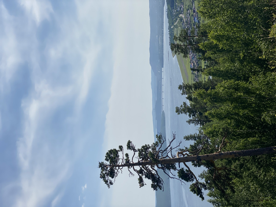 A scenic view from a high vantage point. A wide river dominates the landscape, spanned by a bridge in the distance. Verdant greenery, with lush trees, borders the river. A solitary pine tree with gnarled branches extends into the frame, silhouetted against the soft, cloudy sky. Distant settlements nestled along the river banks create a sense of scale.