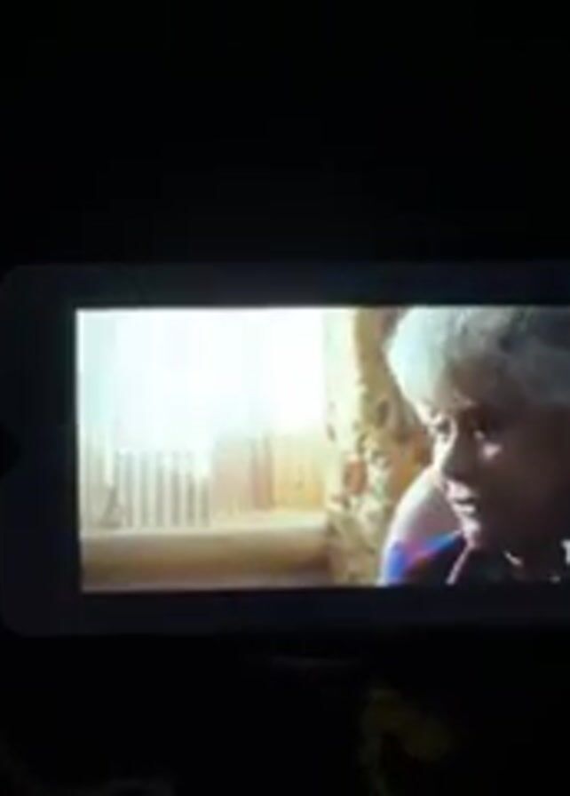 person holding a small tablet in a dark room. The screen displays a scene from a movie, "Spiderwick Book," featuring an older woman with curly gray hair sitting in a chair in a room with a window and a lamp. The "Tareva.TV" logo is visible in the corner. The audio features someone saying, "This is a nice film. Film's name is Spiderwick Book."