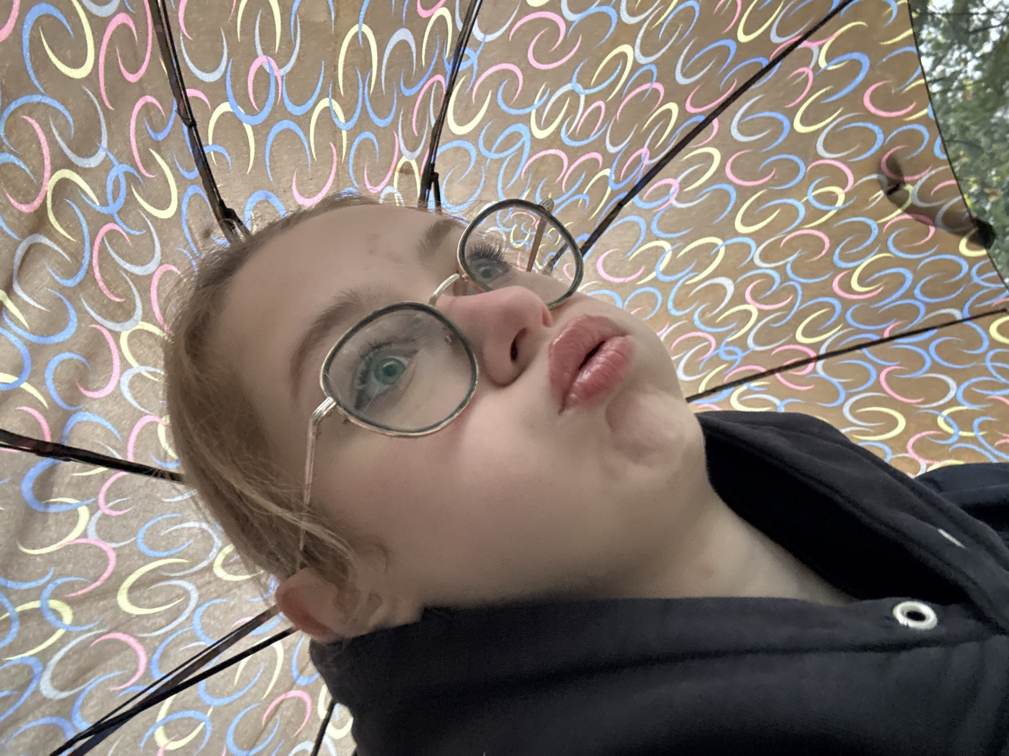 A person with blond hair and wearing round glasses looks up into an open umbrella with a brown background and repeated stylized "S" shapes in pastel blue, pink, and yellow