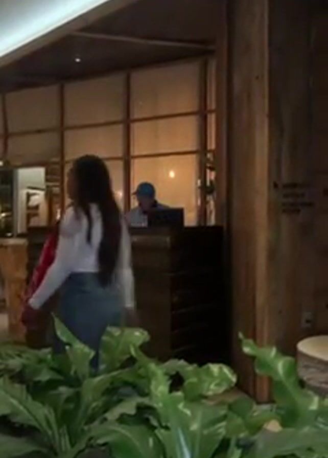 inside of a restaurant or club with modern décor. The scene is warmly lit. A woman in a white long-sleeved shirt and jeans walks past a reception desk manned by a person in a baseball cap. There are plants in the foreground. The camera pans towards a seated person. The background shows a bar and other patrons. Music is playing throughout the video.