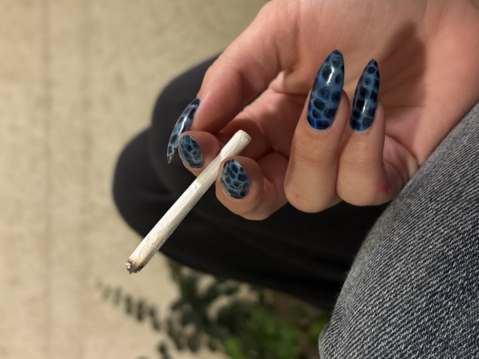 A person holds a lit, hand-rolled cigarette between their fingers. Their fingernails are long and almond-shaped with a blue and black spotted pattern. They are wearing jeans and a dark-colored garment is visible beneath their hand. The background is blurry, showing what appears to be a floor and some greenery. The lighting suggests an indoor setting.