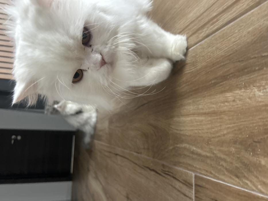 The scene is an indoor domestic environment located in Dragichevo, Bulgaria. In the foreground, a white, long-haired Persian cat is observed in motion, stepping forward with its right front paw. Its fur is dense and white, with prominent white whiskers. The cat possesses amber-colored eyes, and small dark marks are visible near the inner corners of both eyes, possibly tear staining. Its head is slightly lowered, and its gaze is directed generally forward and slightly to the left. The flooring is a light brown, wood-effect laminate or tile. In the mid-ground, a second cat, appearing to be a light grey or silver tabby with dark markings, is partially visible and out of focus, positioned further back in the room, possibly sitting or resting. Its head is turned away from the foreground cat. In the background, a dark brown interior door with a silver handle is discernible on the left, appearing slightly ajar. To the right of the door, a wall section with light-colored vertical slats or paneling is visible.