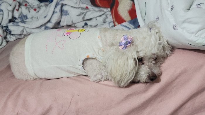 A small white dog rests on a pink bed under blankets and a white pillow. The dog wears a white t-shirt with a cartoon flower on it and has a patterned purple bow in its hair. The dog has its eyes closed and appears to be sleeping. The bedding beneath the dog appears soft and cozy.