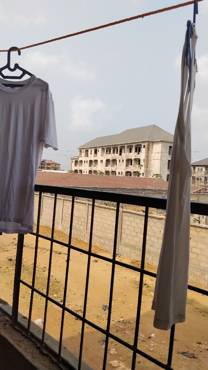 The image displays an outdoor urban environment in Isieke, Nigeria, observed from an elevated vantage point. In the immediate foreground, an orange clothesline spans horizontally across the upper frame. A white short-sleeved t-shirt hangs from a black plastic hanger on the left side of the clothesline, while a white sleeveless garment hangs vertically from the clothesline on the right. Below the hanging laundry, a black metal grid-like railing or grille is present. Beyond the railing, the ground is composed of reddish-brown earth with scattered debris, including white plastic fragments. A light grey concrete block wall, topped with barbed or razor wire, extends horizontally across the midground. Behind this wall, a structure with a reddish-brown corrugated metal roof is visible. In the background, a large, unfinished multi-story concrete building stands prominent. This structure features multiple levels with numerous open rectangular window and door apertures and an uncompleted exterior, topped with a grey hip roof. A second, smaller unfinished building is partially visible to the right. The sky is light blue with scattered white clouds. No individuals are depicted.