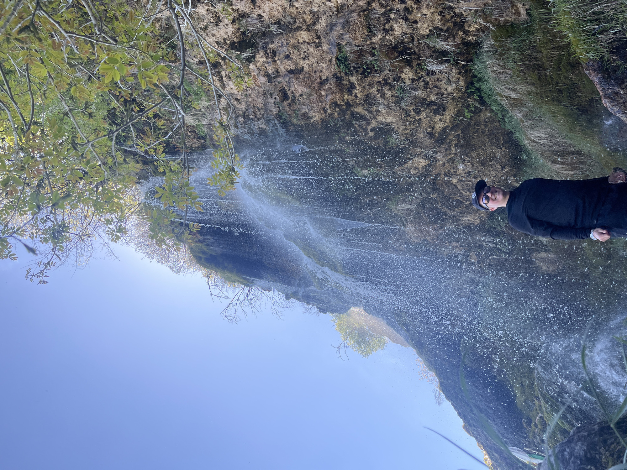waterfall in Razhdavitsa, Bulgaria, viewed from a low angle. A man wearing a black shirt, cap, and sunglasses stands on the right side of the frame, near the waterfall. The sky is blue, visible above the top of the waterfall. The waterfall cascades down a rock face covered with moss and vegetation. Trees with green and yellow leaves are visible at the top left of the frame.
