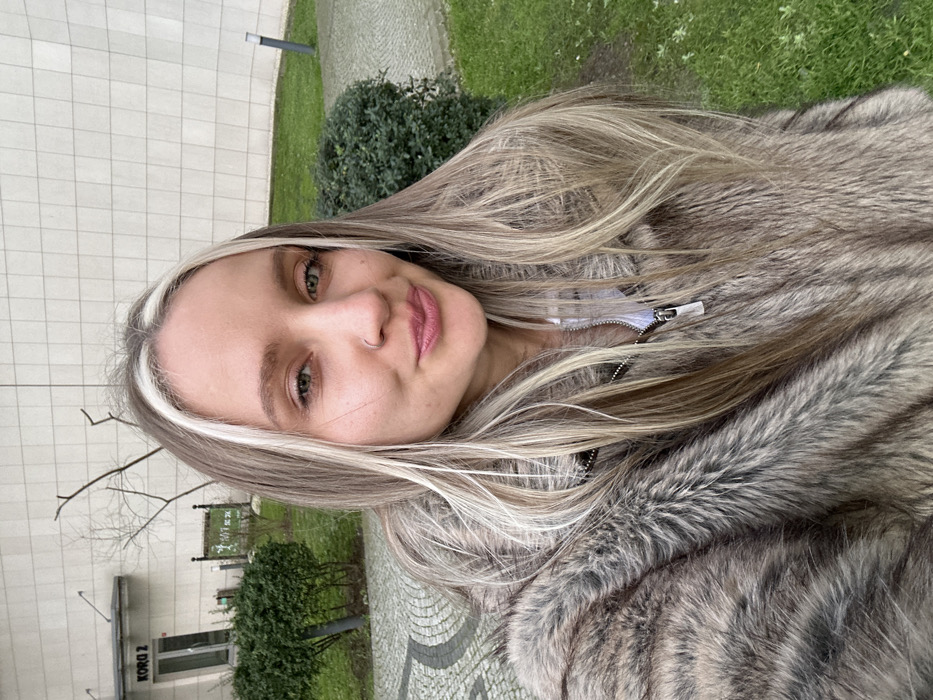 A female individual is captured in a close-up, chest-up shot, facing the camera with a subtle smile. She possesses long, multi-toned blonde hair featuring prominent lighter, possibly platinum, streaks framing her face. Her eyes are green, and she has a small silver ring piercing in her right nostril. She is wearing a thick, multi-toned brown and grey faux fur coat, with a white zippered garment visible underneath. The background consists of a modern building with a light-colored, likely beige, horizontally paneled facade. An entrance on the left side of the building is labeled "KORU 2" in black text, indicating a specific structure within a complex. The area immediately behind the subject includes well-maintained green grass, trimmed dark green hedges, and a paved walkway featuring a circular pattern of dark and light grey interlocking stones. Sparse, bare tree branches are visible against the building, and a dark, cylindrical bollard-style light fixture is present on the right side of the frame. The scene is situated within a residential or commercial complex in Başakşehir, Istanbul, Turkey.