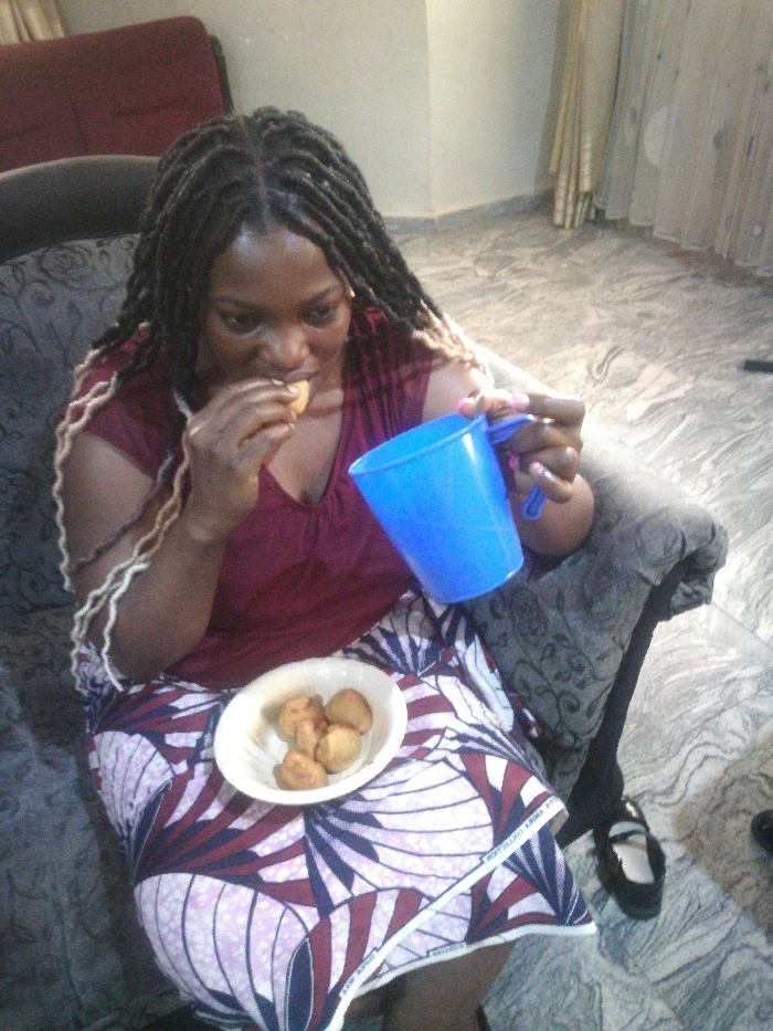 An adult female with dark skin and long black dreadlocks featuring lighter-colored ends is seated in an indoor domestic setting. She is wearing a dark red v-neck top and a patterned skirt with white, purple, and dark red geometric designs. She is actively eating a small, round, fried pastry-like item, holding it to her mouth with her right hand. Her left hand holds a bright blue plastic cup. A white bowl containing approximately five additional identical food items rests on her lap. She is seated in a grey upholstered armchair. In the background, a portion of a maroon upholstered chair or sofa is visible, along with a light-colored, patterned tiled or marble floor and light-colored curtains. The location is an unidentifiable indoor residence within the city of Unknown, Unknown.