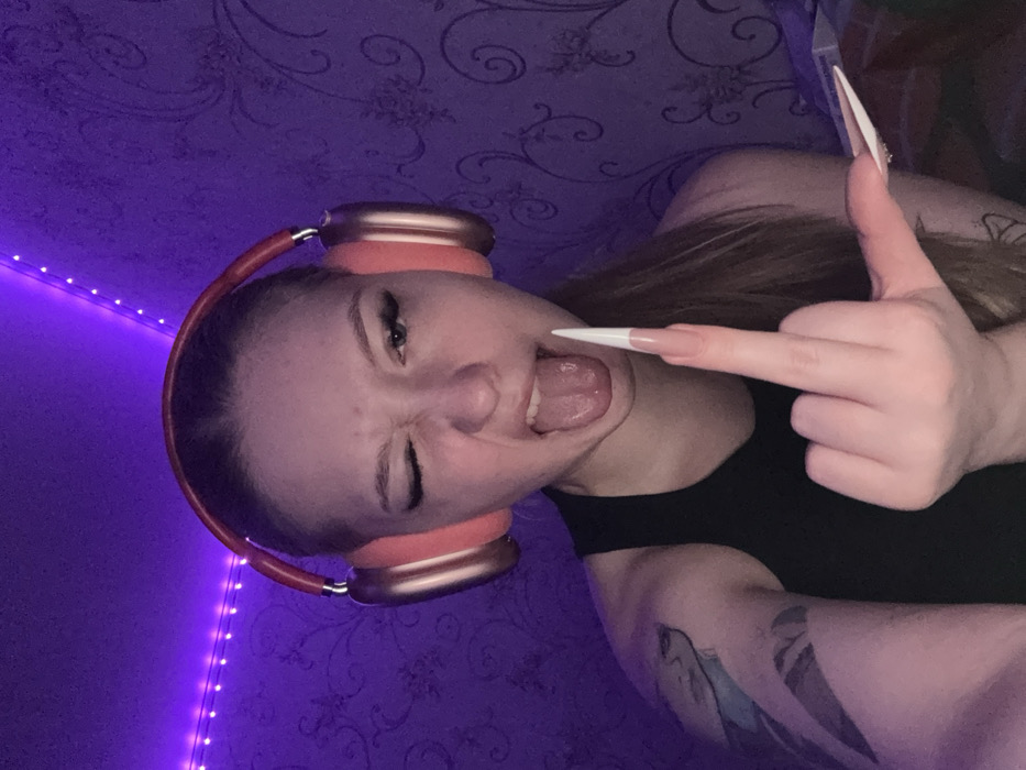 An image, reportedly captured in a room within the city of Saratov, Russia, displays a single young female subject from the chest up. She wears large, salmon pink or rose gold over-ear headphones and a black sleeveless garment. Her left eye is closed in a wink, her right eye is open, and her mouth is agape with her tongue extended. The subject's left hand is raised, with the middle finger extended upwards in a gesture of defiance or insult; her fingernails are notably long, pointed, and feature a French tip style (natural pink base with white tips). A tattoo, depicting a stylized figure or face, is visible on her upper left arm. Her long, light brown hair is visible over her right shoulder. The background wall features patterned wallpaper (floral or damask) and is illuminated by purple LED string lights, which cast a predominant purple hue over the entire scene. Undefined objects are partially visible and out of focus in the lower right portion of the frame.