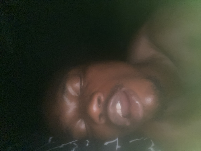 A person with brown skin is lying down with their eyes closed and mouth slightly open. The background is dark, making it difficult to discern details. The person's face is the main focus, taking up a large portion of the image. A pattern is visible on the bedding beneath the person. The photo has some blurred areas, especially around the edges.
