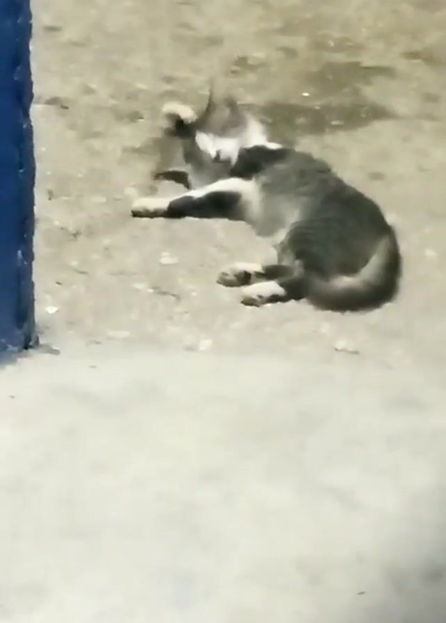 small grey and white kitten lying on its back on a concrete surface. It's playing with something in its paws. To the left of the kitten is a blue wall or pillar. The background is slightly blurry. The sound of traffic is audible.