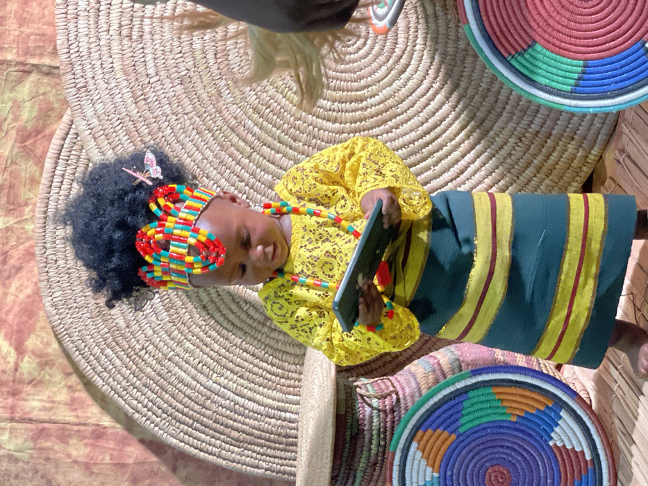 A young child, approximately two to four years old, stands barefoot, centered in the frame. The child has dark, curly afro-style hair adorned with a multicolored beaded crown (red, yellow, green, blue) and a small pink and white butterfly hair clip on the right side. They are wearing a long-sleeved, yellow lace top and a dark green skirt or wrapper with horizontal yellow and thin red stripes. A multicolored beaded necklace (red, green, yellow) is visible around their neck. The child holds a dark-colored tablet or smartphone with both hands, looking down at its screen. The background features woven straw or wicker panels, including a large curved one behind the child, suggesting a decorative or studio setting. To the left, a portion of a straw hat or basket is visible on a surface, and below it, a colorful woven circular mat or shallow basket with concentric patterns in blue, purple, orange, green, and white. Another similar colorful woven circular item, predominantly red, blue, and white, is partially visible on the right foreground. A reddish-brown patterned fabric backdrop is behind the woven panels. The scene is located in Barakin Akawo, Nigeria.
