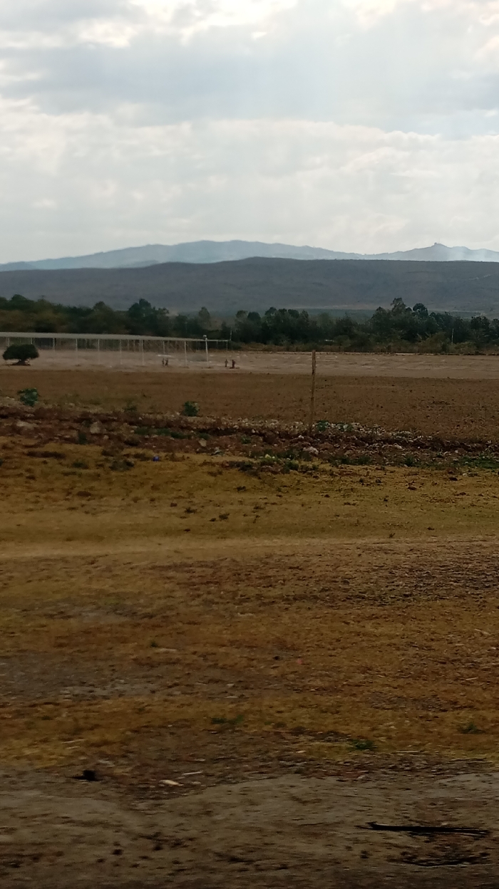 A wide, flat, arid landscape under a cloudy sky. Distant mountains are visible on the horizon. A fence runs across the mid-ground with a few figures standing near it. The foreground is dominated by dry, uneven terrain with patches of vegetation. The colors are muted, mainly browns and greens.