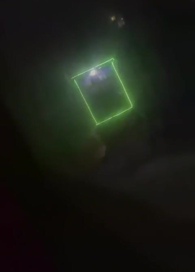 nighttime view, slightly angled, of a rectangular shape outlined by small red lights, likely LED string lights. Inside the rectangle, there's a blurry image of something that appears to be a building or structure with some lights illuminating it. The surrounding area is dark.