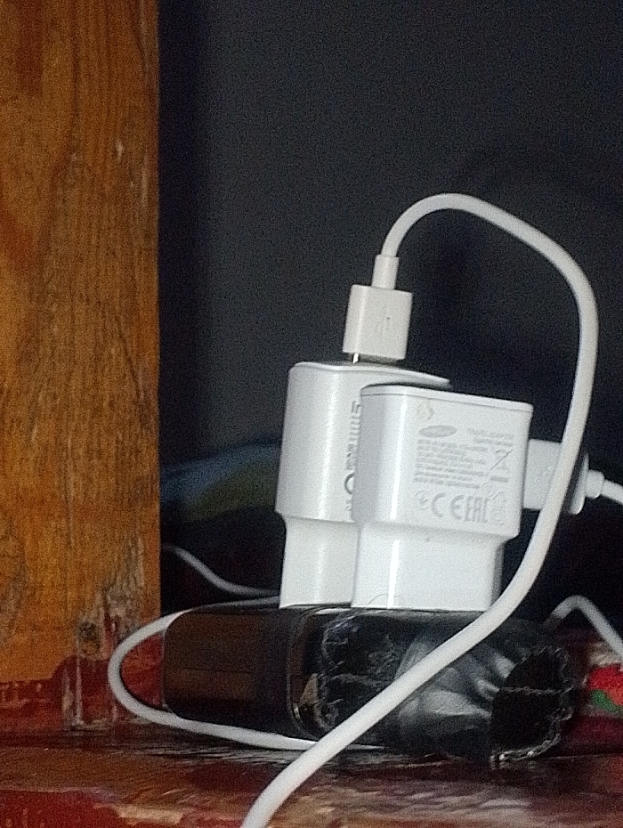 Two white Samsung wall chargers are stacked. The top charger has a white USB cable plugged into it. A black, damaged or melted adapter sits beneath the chargers. The objects rest on a wooden surface, with a wooden post to the left and a dark background behind them.