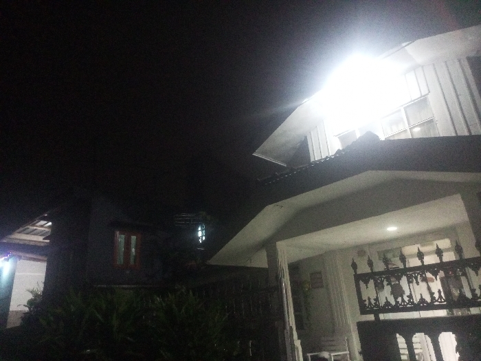 The image depicts a residential scene at night in Ciherang, Indonesia. The foreground features dark, dense foliage obscuring the lower portions of two prominent structures. To the right, a multi-story building is illuminated. Its ground level includes a covered entrance area with an overhead light and a dark, ornate metal railing or gate. The upper level of this structure displays a brightly lit window, emitting significant glare. To the left, a darker building with a red-framed window is partially visible, and further left, another structure with a corrugated roof and internal illumination can be discerned. The sky above is dark, consistent with nighttime conditions. No individuals are present, and no actions or interactions are observed.