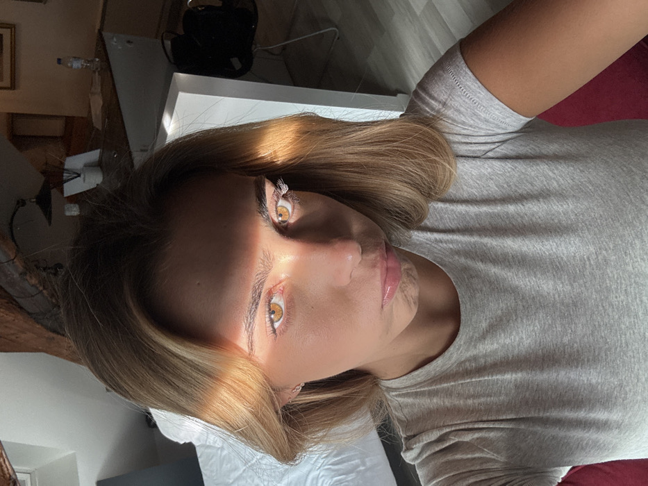 - "An indoor, chest-up portrait depicts a young female with shoulder-length, light brown hair and amber eyes, dressed in a grey t-shirt" by FM-6wyrF3, licensed under CC BY 4.0