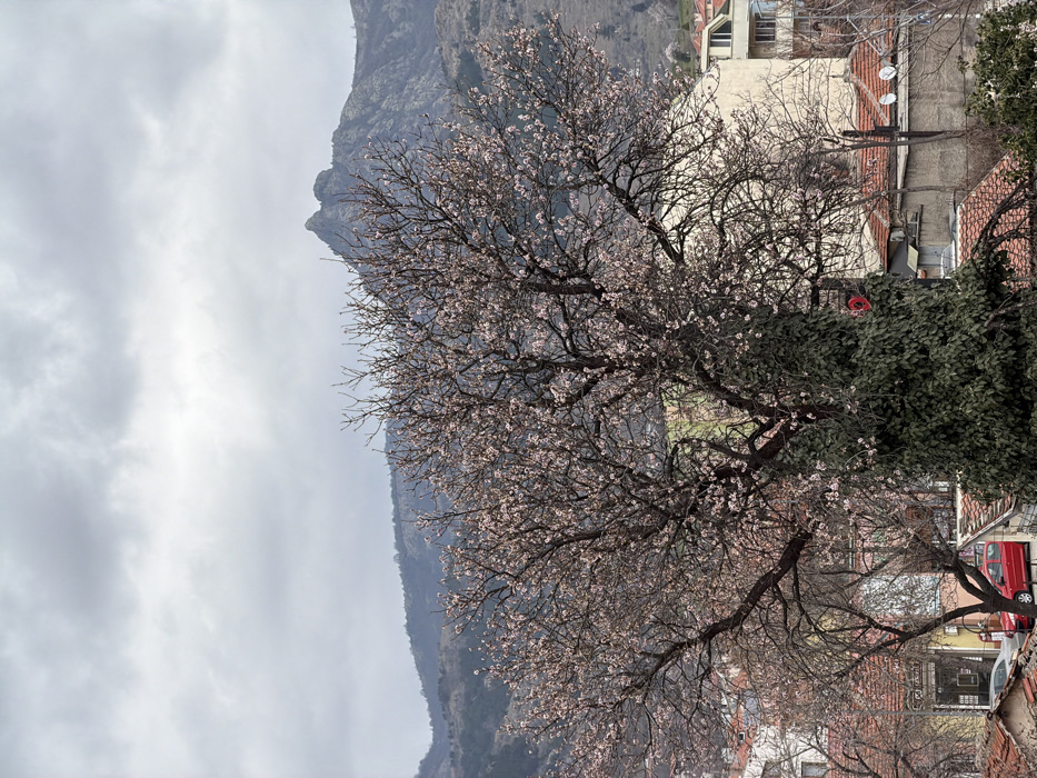 The image depicts an urban landscape in Sliven, Bulgaria, viewed from an elevated position, with prominent mountains in the background under an overcast sky. In the foreground, a large deciduous tree, adorned with numerous small light pink blossoms, dominates the central frame, signifying early spring. Its main trunk, particularly on the right, is heavily enveloped in dark green ivy. A small red heart-shaped object is visible within the ivy on the trunk. Below and around this tree, a dense residential area is visible, characterized by multiple buildings with red-tiled roofs and varying architectural designs. A red compact car is parked on a street or driveway in the lower-left section. Several white satellite dishes are affixed to rooftops in the mid-ground. The mid-background features rolling hills and mountains covered with sparse, dry-looking vegetation. A distinct, rugged mountain peak with a pointed, double-crested profile, characteristic of the Sinite Kamani (Blue Stones) National Park and likely Halkata peak, is prominent in the upper-right background. The sky is completely overcast with a uniform layer of light gray clouds, diffusing the natural light across the scene. No individuals or discernible actions are visible.