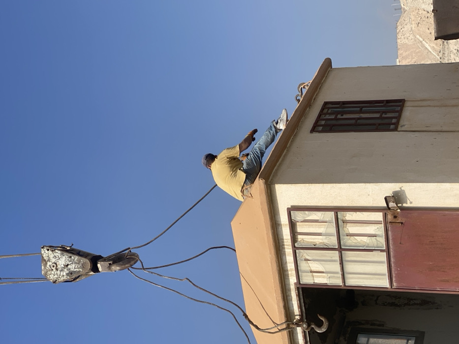 An outdoor scene in Dahiyat Harasta, Syria, depicts a man engaged in an activity on the roof of a small building under a clear blue sky. The man, seen from behind, wears a yellow short-sleeved shirt, blue jeans, white sneakers, and a dark baseball cap. He is positioned in a seated or squatting posture on the sloped, reddish-brown roof of a single-story, light-colored building. Above him, a large, weathered grey crane hook with multiple wire ropes is suspended, with one set of ropes extending downwards towards the man and the building. The man appears to be gripping or manipulating one of these ropes with his right hand. The building exhibits signs of disrepair. On its left side, a window with multiple broken glass panes is visible, along with a partially open, reddish-brown metal door below it. Another window with a reddish-brown frame and vertical bars is present on the right side of the building. The building's walls show staining and dirt accumulation. In the distant background, a light-colored, dusty mound or hill is discernible, indicative of an arid or disturbed environment.