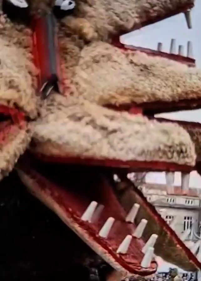 close-up of a large, imposing costume. The costume appears to be of a multi-headed creature, possibly canine, made of light brown fur-like material. The costume's heads feature large, open mouths with prominent white teeth and red interiors. The eyes are black and white, giving a somewhat unsettling appearance. A red and black nose is visible on one of the heads. In the background, a blurred crowd can be seen, suggesting the costume is part of a parade or festival. The overall impression is that of a folkloric or mythological creature brought to life.