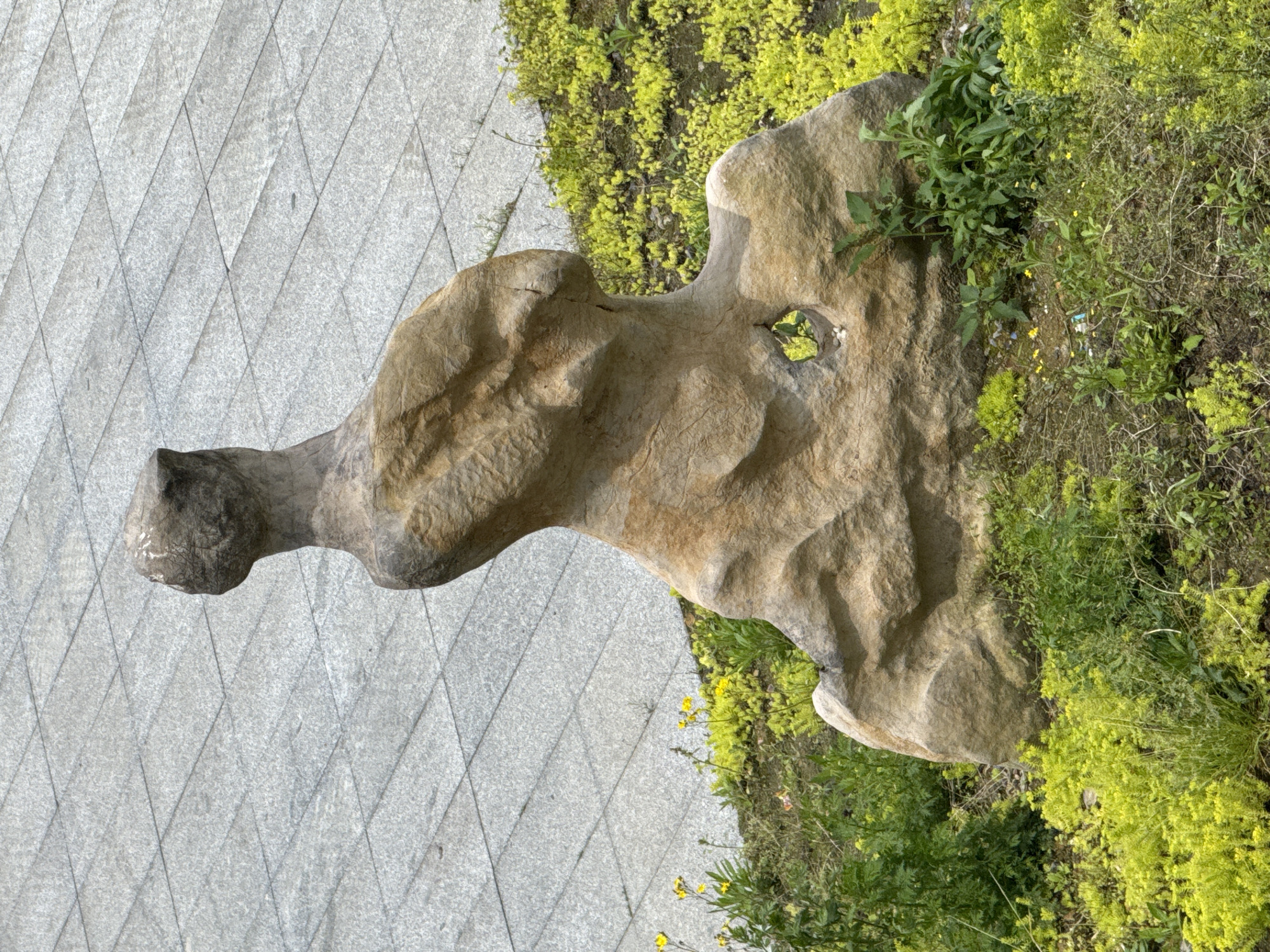stone sculpture positioned on a diamond-patterned grey concrete surface in Wulong District, China. The sculpture is brown and tan and is surrounded by green and yellow ground cover vegetation. The stone has a hole through it.