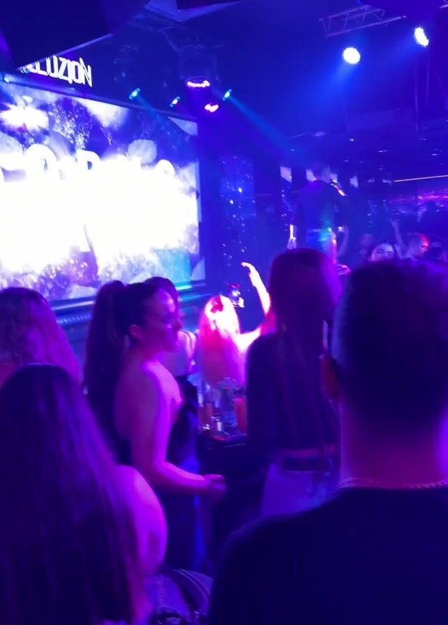 performance by a singer named Boris Dali in a nightclub. A large screen behind the stage has his name in large letters. The singer, wearing a black button-down shirt and blue jeans, stands on the stage and sings into a microphone. The nightclub is dark, with bright blue and purple lights. The audience stands close to the stage, with some holding up phones to record the performance.