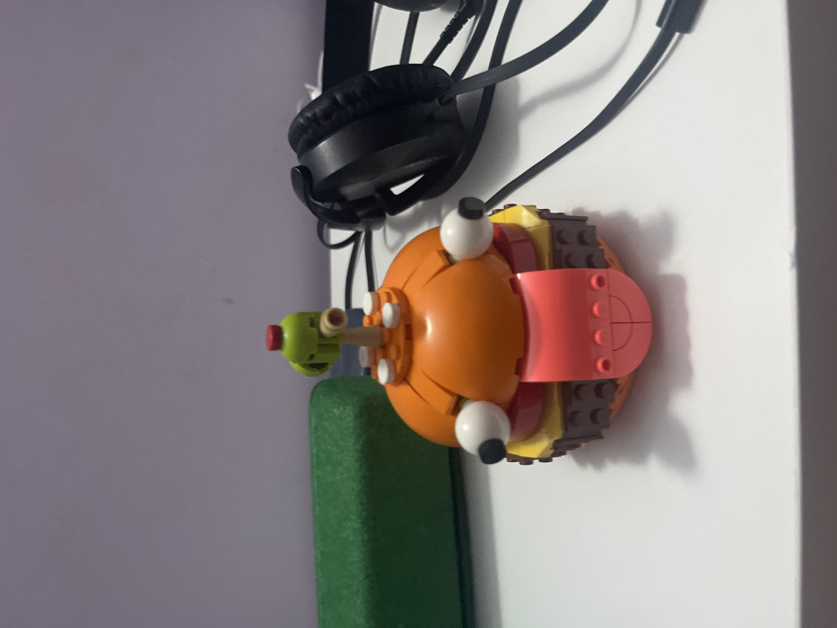 A LEGO-built character, resembling a stylized hamburger with googly eyes and a red tongue-like element depicting a smiling face, rests on a white surface