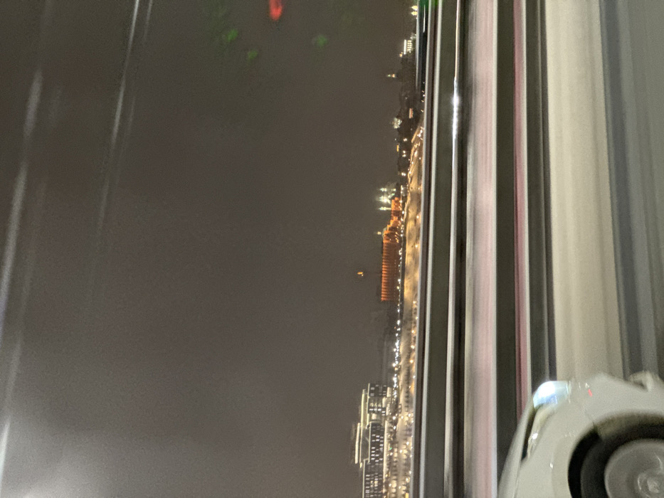 A nighttime view from a high vantage point overlooks a city's coastline obscured by haze. The lights of buildings and roads stretch along the coast. A high-rise building is visible in the center. Part of a white vehicle is in the corner, with a reflection. Several vertical streaks suggest the presence of glass windows. The sky is dark and cloudy.