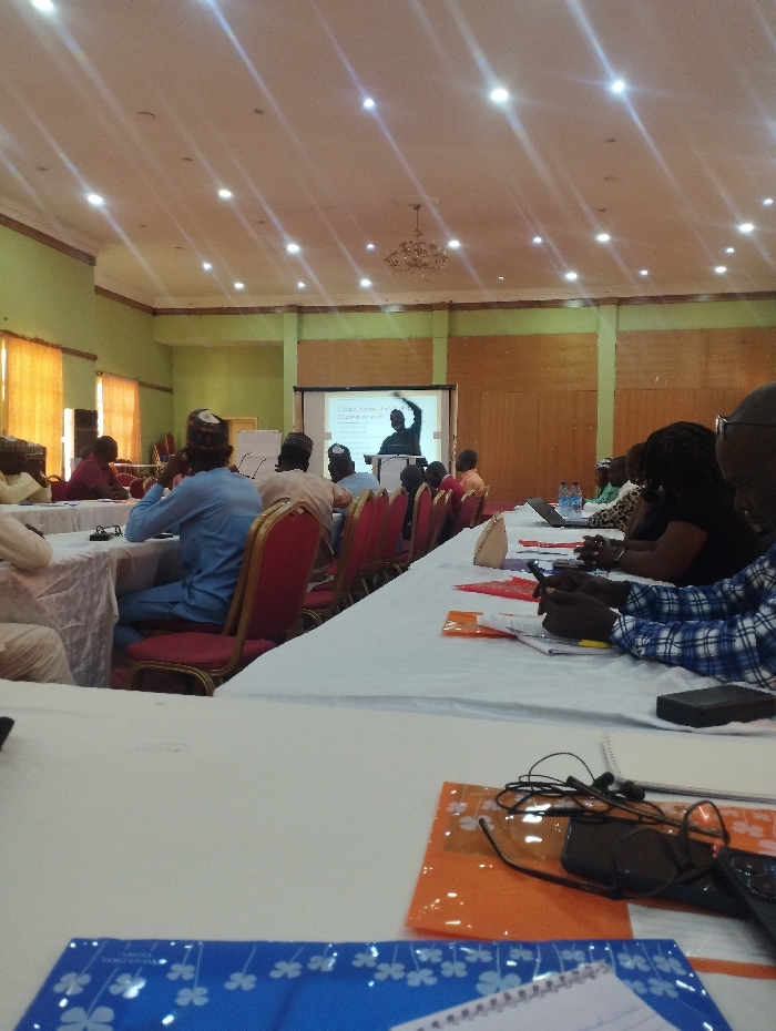 The image displays an indoor conference or workshop occurring in a large room in Gombe, Nigeria