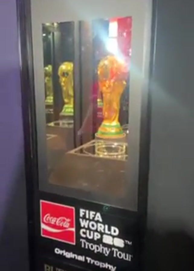close-up of the FIFA World Cup trophy, encased in a glass display cabinet. The trophy is gold in color and is sitting on a clear plastic pedestal. The cabinet has a black frame and contains reflective surfaces that create multiple images of the trophy. Below the trophy, on the cabinet, are logos for Coca-Cola and the FIFA World Cup Trophy Tour, along with the words "Original Trophy" and "Buenos Aires." The camera slowly zooms in on the trophy, capturing details of its design. In the background, indistinct ambient sounds can be heard.